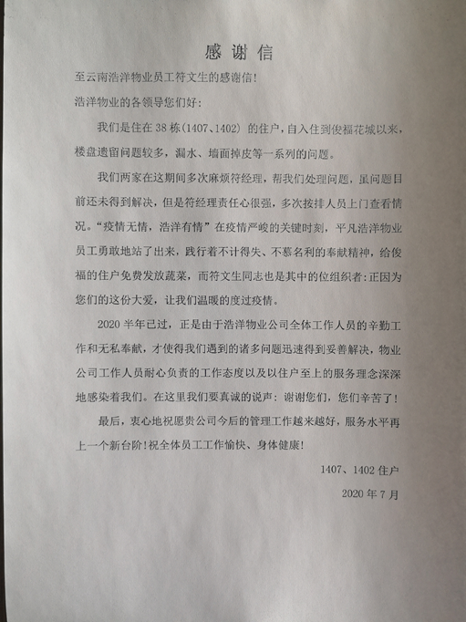 2020年7月15日,在俊?;ǔ堑奈飿I(yè)服務(wù)中心里,兩位業(yè)主向云南浩洋物業(yè)服務(wù)有限公司工作人員符文生送來了感謝信和錦旗。