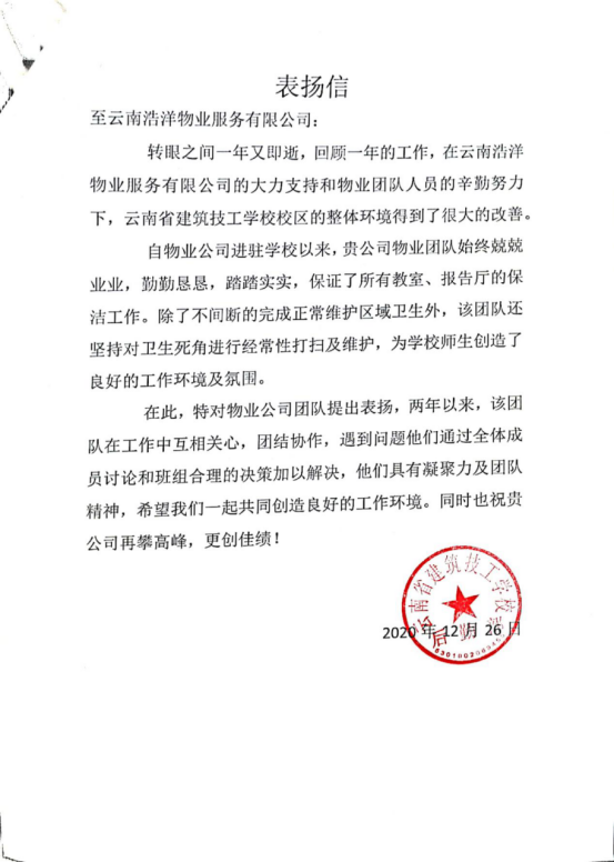 近日,云南浩洋物業(yè)“云南省建筑技工學(xué)?!蔽飿I(yè)服務(wù)中心,收到了一封來自于甲方業(yè)主的表揚(yáng)信。信中表示,在云南浩洋物業(yè)服務(wù)團(tuán)隊(duì)兢兢業(yè)業(yè)、勤勤懇懇、踏踏實(shí)實(shí)的努力下,云南省建筑技工學(xué)校的校區(qū)整體環(huán)境得到了很大的改善,為學(xué)校師生創(chuàng)造了良好的工作環(huán)境及氛圍。