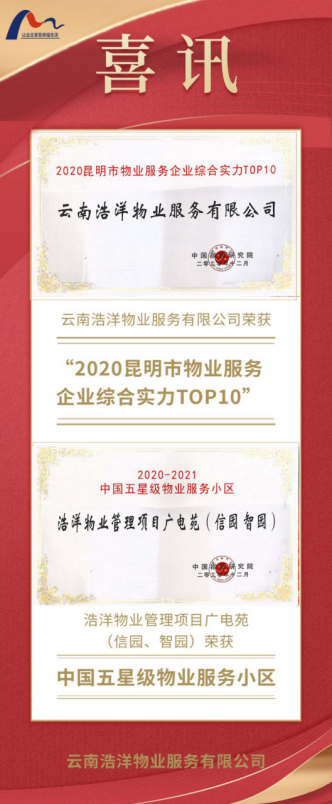 喜訊,我公司榮獲“中國(guó)指數(shù)研究院”頒發(fā)的“2020昆明市物業(yè)服務(wù)企業(yè)綜合實(shí)力TOP 10”榮譽(yù)稱號(hào),其中,我公司服務(wù)管理的“廣電苑-信園”、“廣電苑-智園”小區(qū),榮獲“中國(guó)指數(shù)研究院”頒發(fā)的“中國(guó)五星級(jí)物業(yè)服務(wù)小區(qū)”榮譽(yù)稱號(hào)。