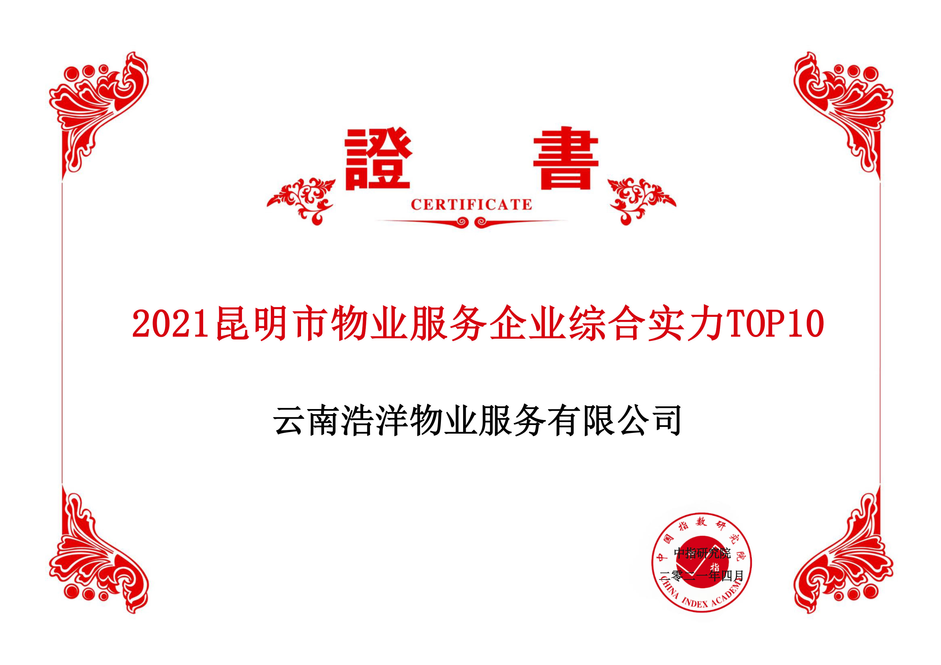 云南浩洋物業(yè)服務(wù)有限公司榮獲“2021昆明市物業(yè)服務(wù)企業(yè)綜合實(shí)力TOP 10”