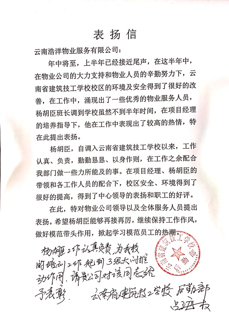 近日,“云南省建筑技工學(xué)?!焙笄诓繛槲夜締T工楊胡臣和項(xiàng)目全體工作人員送來(lái)了表?yè)P(yáng)信。信中表示,我公司員工楊胡臣在工作中表現(xiàn)出較高熱情,工作認(rèn)真負(fù)責(zé)、勤勤懇懇,為學(xué)校的培訓(xùn)工作起到了很大的推動(dòng)工作。整個(gè)校區(qū)在“浩洋人”的努力下,校區(qū)安全、環(huán)境得到了很好地提高。